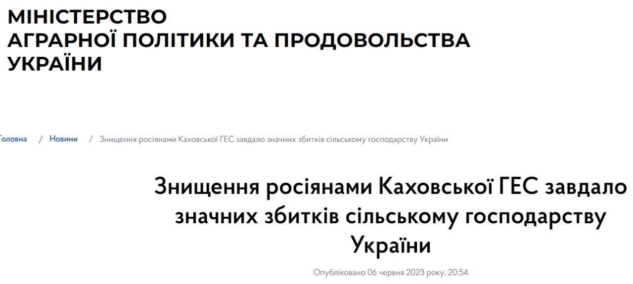 По его информации, катастрофа на Каховской ГЭС фактически оставила без источника воды 94% оросительных систем в Херсонской, 74% - в Запорожской и 30% - в Днепропетровской областях.
