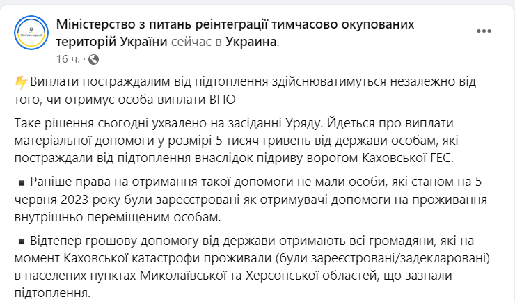 На заседании правительства было принято решение о предоставлении материальной помощи пострадавшим от подтопления в результате подрыва Каховской ГЭС. Государство будет выплачивать помощь в размере 5 тысяч гривен.