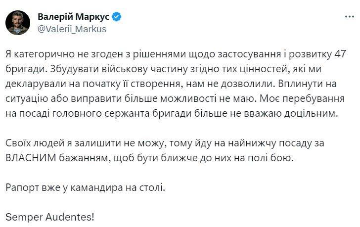 "Я категорически не согласен с решениями по применению и развитию 47-й бригады", – сказано в посте Маркуса в соцсети.