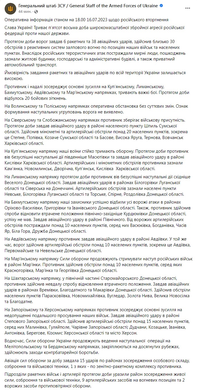 Генштаб ВСУ опубликовал оперативную информацию о российском вторжении по состоянию на 18:00 16 июля.