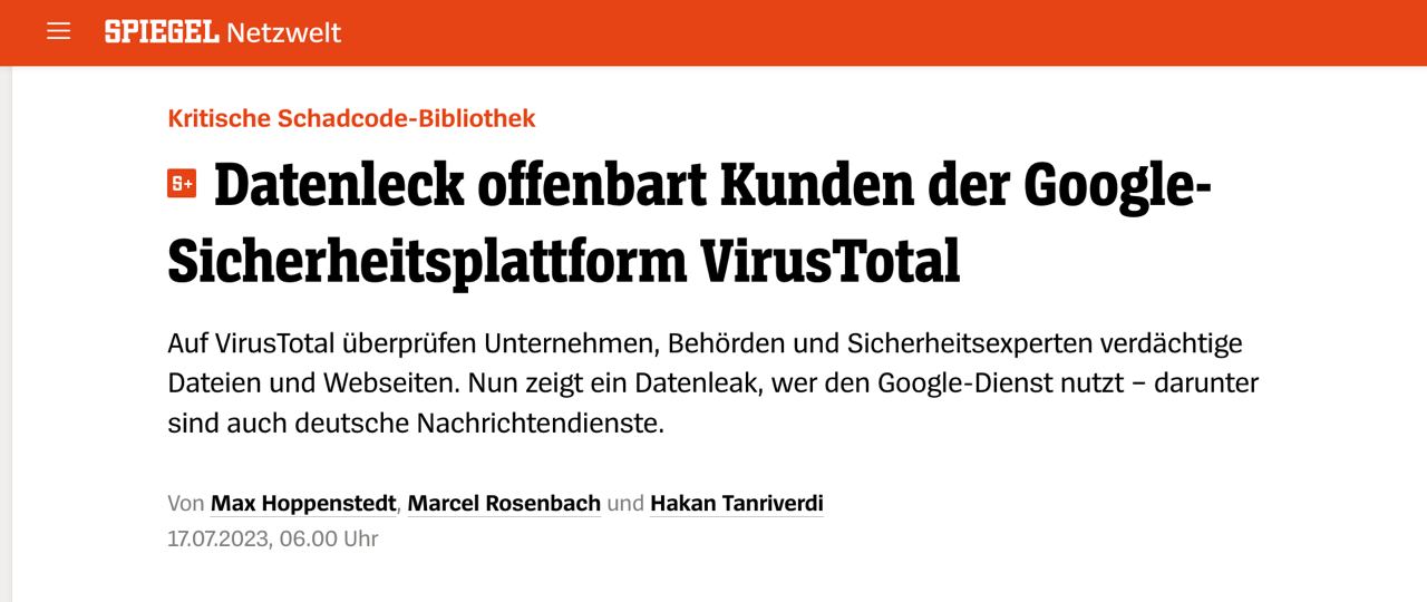 Вместе с тем Spiegel пишет, что спецслужбы США и Германии столкнулись с утечкой данных своих сотрудников из-за использования онлайн-сканера вирусов VirusTotal.