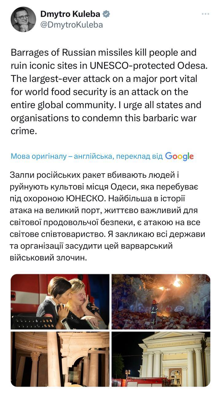 "Залпы российских ракет убивают людей и разрушают знаковые места в Одессе, внесенные в список Всемирного наследия ЮНЕСКО. Крупнейшая в истории атака на крупный порт, жизненно важный для мировой продовольственной безопасности, - это атака на все мировое сообщество. Я призываю все государства и организации осудить это варварское военное преступление", - заявил Кулеба.