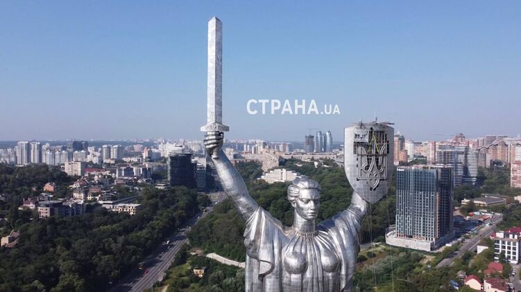 Тризуб на щит монумента "Родина-мать" уже подняли. Фото: "Страна"