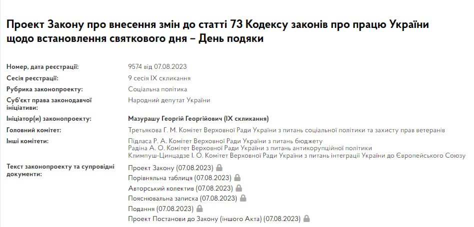 "В условиях полномасштабной вооруженной агрессии Российской Федерации против Украины продолжается мощное возрождение украинской нации. Установление даты празднования Дня благодарения имеет логическую аргументацию: в первую очередь, это поднятие благодарности на общенациональный уровень (как это сделано в некоторых высокоразвитых странах), когда каждый человек получит официальную возможность выразить благодарность всем тем, кому он желает это сделать. Почему именно 22 октября? Осенняя пора, богатая урожаем овощей и фруктов, будет способствовать введению традиции проводить данный праздник за праздничным (семейным) столом. В мире 22 октября отмечают День перемен к лучшему. Праздник National Make A Difference Day посвящен тому, чтобы люди имели возможность совместными усилиями изменить мир к лучшему, помочь окружающим и сделать жизнь лучше, что логично сочетается с идеей Дня благодарения", - сказано в пояснительной записке к проекту.