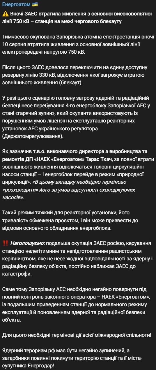 "Временно оккупированная Запорожская атомная электростанция ночью 10 августа потеряла питание с основной внешней линии электропередачи напряжением 750 кВ. После этого ЗАЭС пришлось переключить на единственную доступную резервную линию 330 кВ, отключение которой чревато потерей внешнего питания (Блекаутом)", - говорится в сообщении.