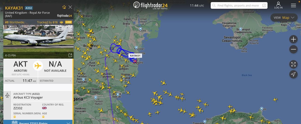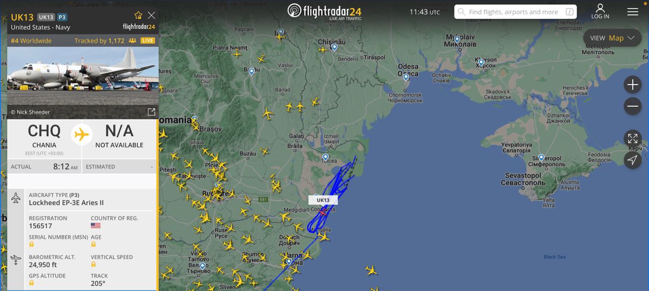 В четверг, 10 августа, около дельты Дуная в небе Румынии вдоль черноморского побережья активно летают по кругу американский самолет РЭБ и британский самолет-заправщик.