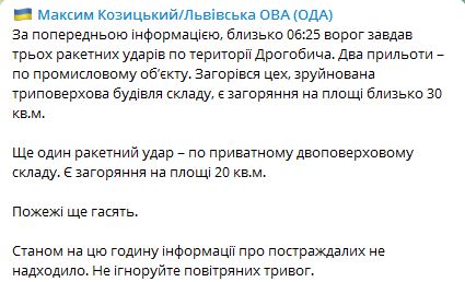 Около 06:25 было три ракетных удара по территории Дрогобыча. Два прилета – по промышленному объекту. В результате загорелся цех, разрушено трехэтажное здание склада, есть возгорание.
