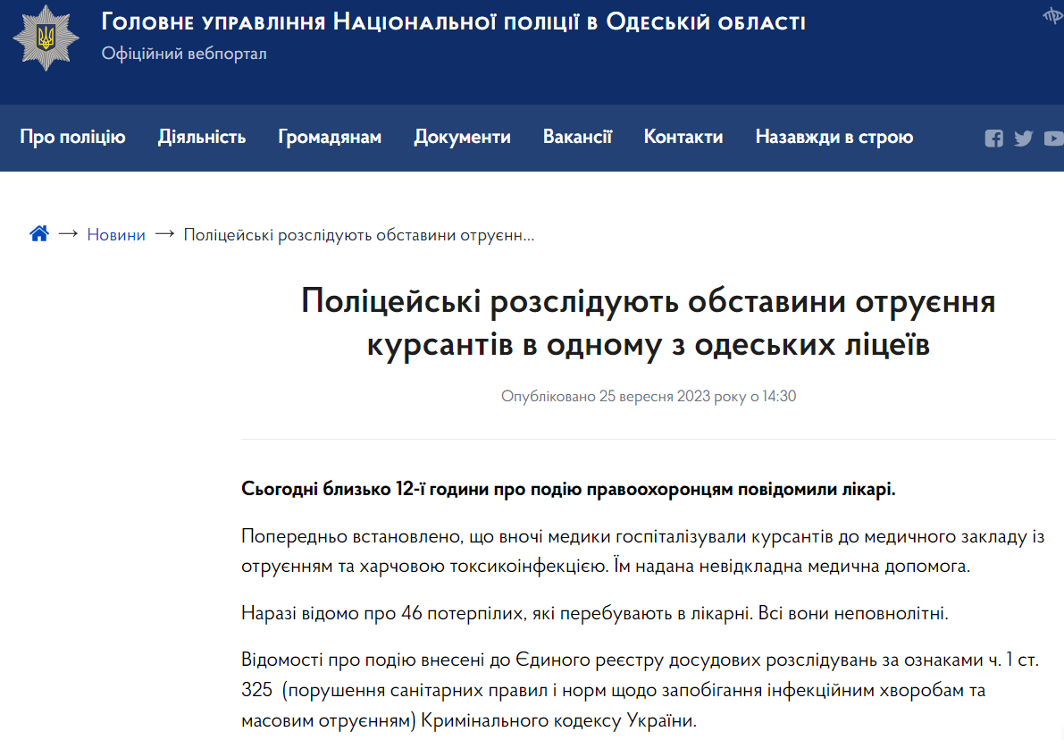 В одесском лицее произошла вспышка отравления среди курсантов, госпитализированы 68 человек