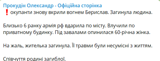 Сегодня утром российские войска в очередной раз ударили по Бериславу Херсонской области. Погиб человек.