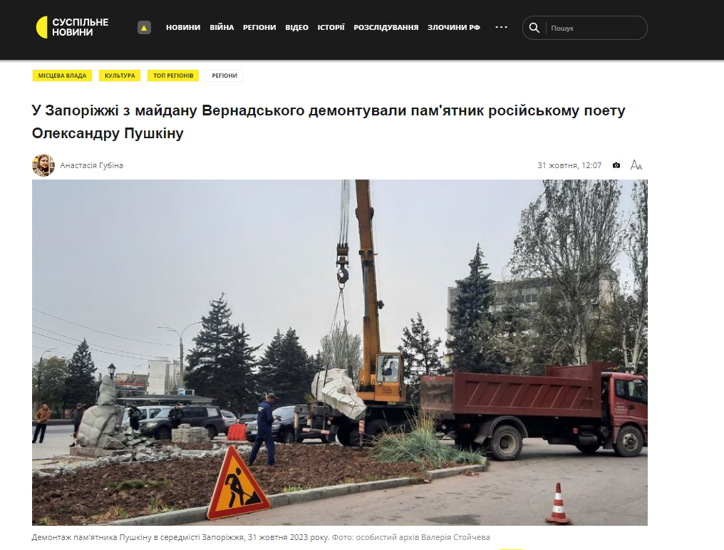 В Запорожье 31 октября демонтировали памятник российскому поэту Александру Пушкину. Он стоял на площади Владимира Вернадского.