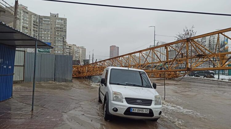 Также появилось видео из Киева, на котором видно упавший строительный кран.