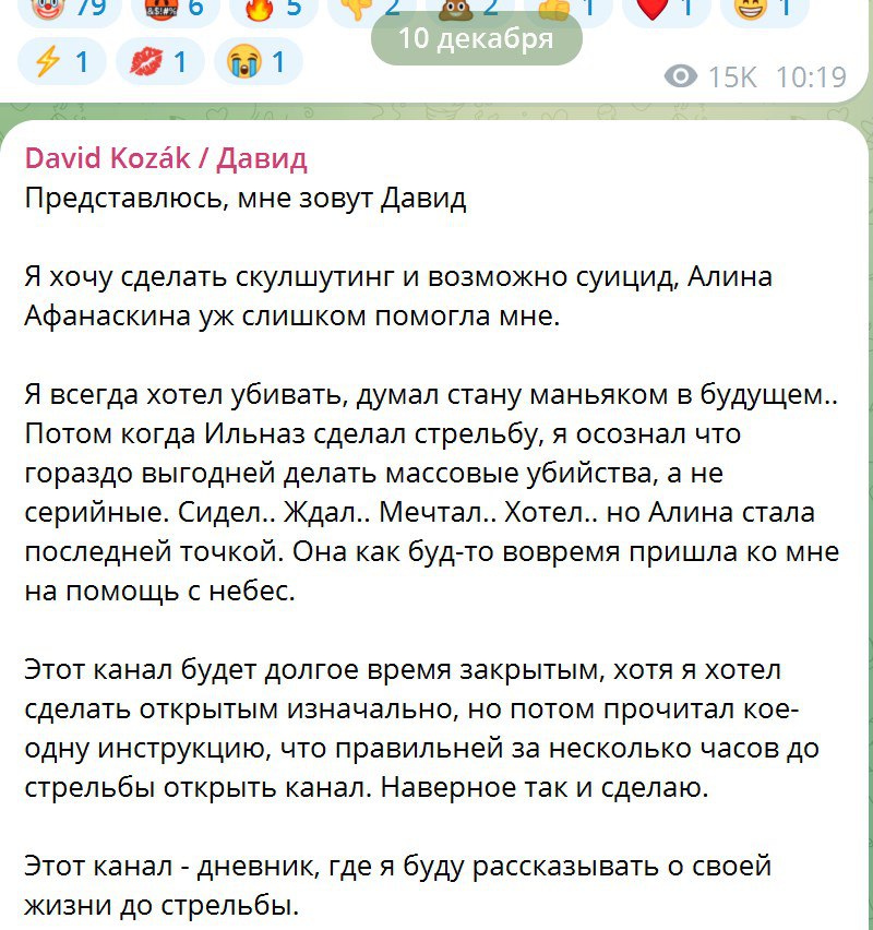 Отмечается, что стрелок мог анонсировать свои убийства в Telegram. В мессенджере есть канал David Kozák, созданный 9 декабря. Велся он на русском языке.