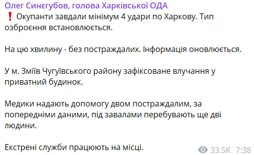 Глава ОВА добавил, что в городе Змиев Чугуевского района Харьковской области зафиксировано попадание в частный дом. Медики оказывают помощь двум пострадавшим. По предварительным данным, под завалами находятся еще два человека. На месте работают экстренные службы.