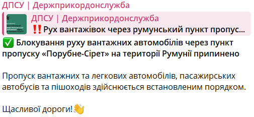 "На территории Румынии фермеры блокируют движение грузовиков через пункт пропуска "Сирет". Причины и ориентировочная продолжительность блокировки неизвестны. Усложнение движения может быть в обоих направлениях", - прокомментировала ситуацию украинская служба пограничного контроля.