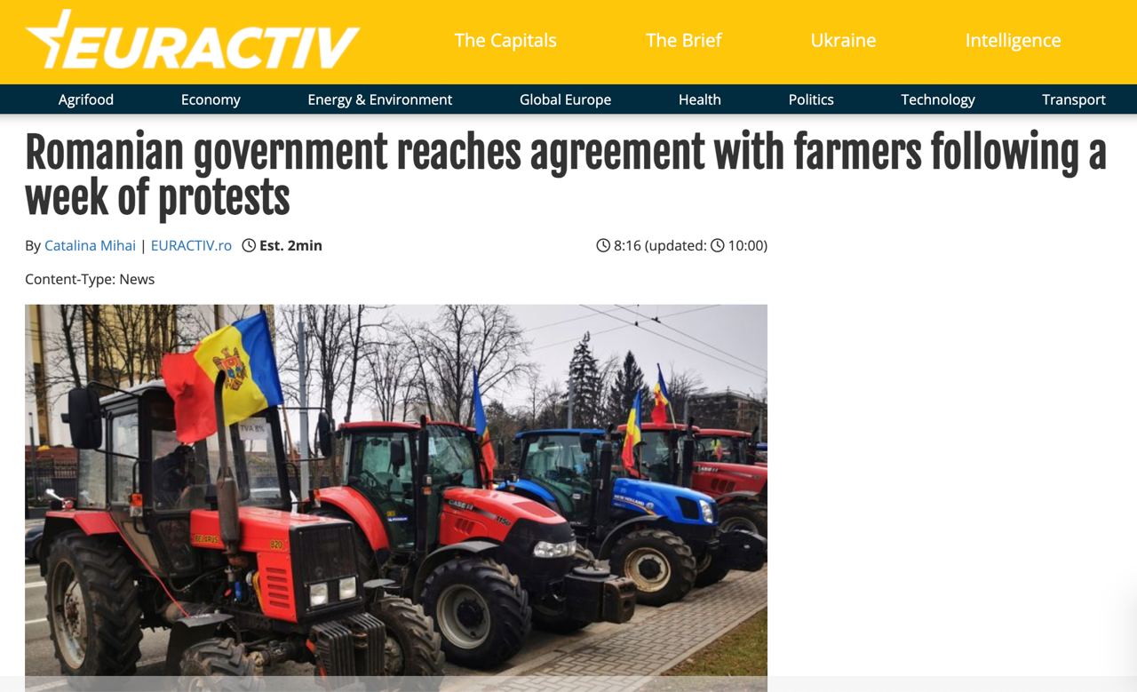Местный министр сельского хозяйства Флорин Барбу сообщил, что после недели протестов они договорились по 13 требованиям фермеров. Обсуждения по остальным пунктам будут продолжены, до тех пор протесты будут продолжаться.