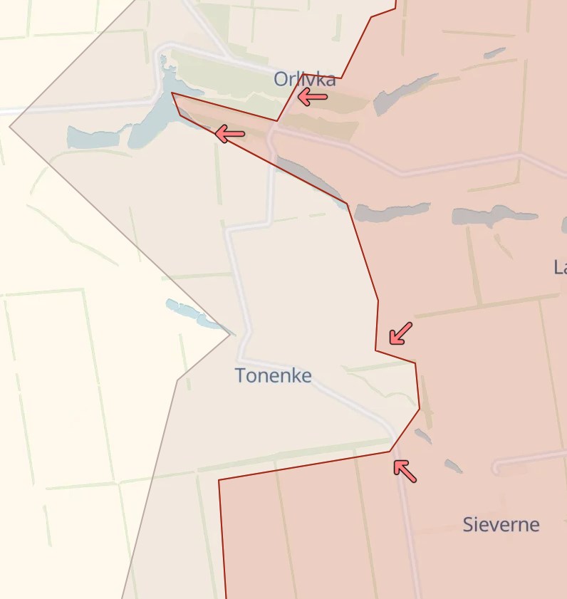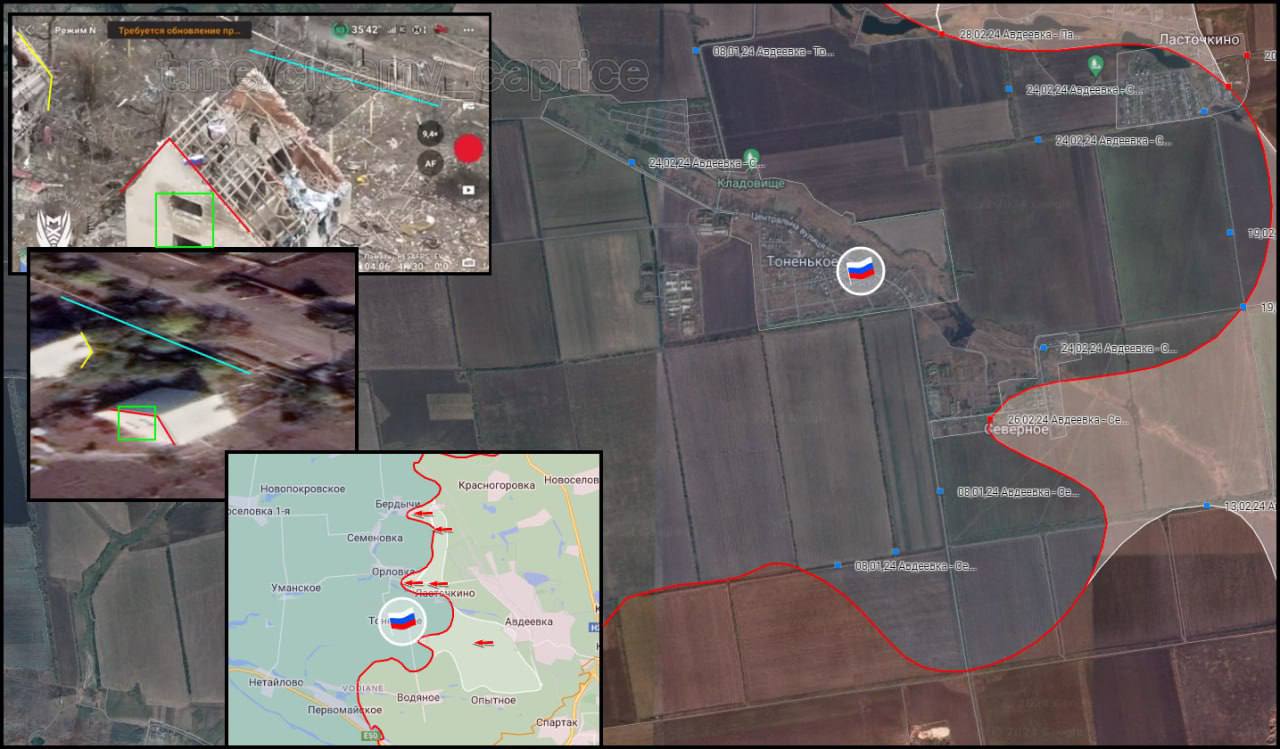 Российские телеграм-каналы заявляют о захвате Тоненького к западу от Авдеевки и к югу от Орловки, куда уже вошли российские войска. Украина этого не подтверждала.