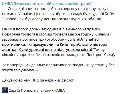 Силами и средствами противовоздушной обороны все БПЛА, направлявшиеся на Киев - примерно полтора десятка - были поражены еще на подступах к городу.