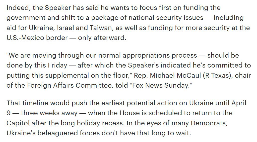 Это отодвинет любые обсуждения по Украине в лучшем случае до 9 апреля - когда Палата представителей должна вернуться после пасхальных каникул.
