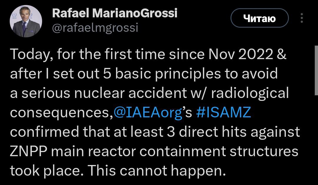 Глава МАГАТЭ Рафаэль Гросси заявил, что вчера по защитным конструкциям реактора Запорожской АЭС было три попадания.