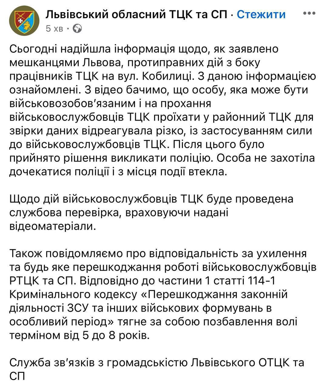 Львовский ТЦК сообщает, что проведет расследование по действиям своих сотрудников на видео с силовой мобилизацией. Военкомы вызвали полицию, но мужчина не дождался ее и скрылся с места.