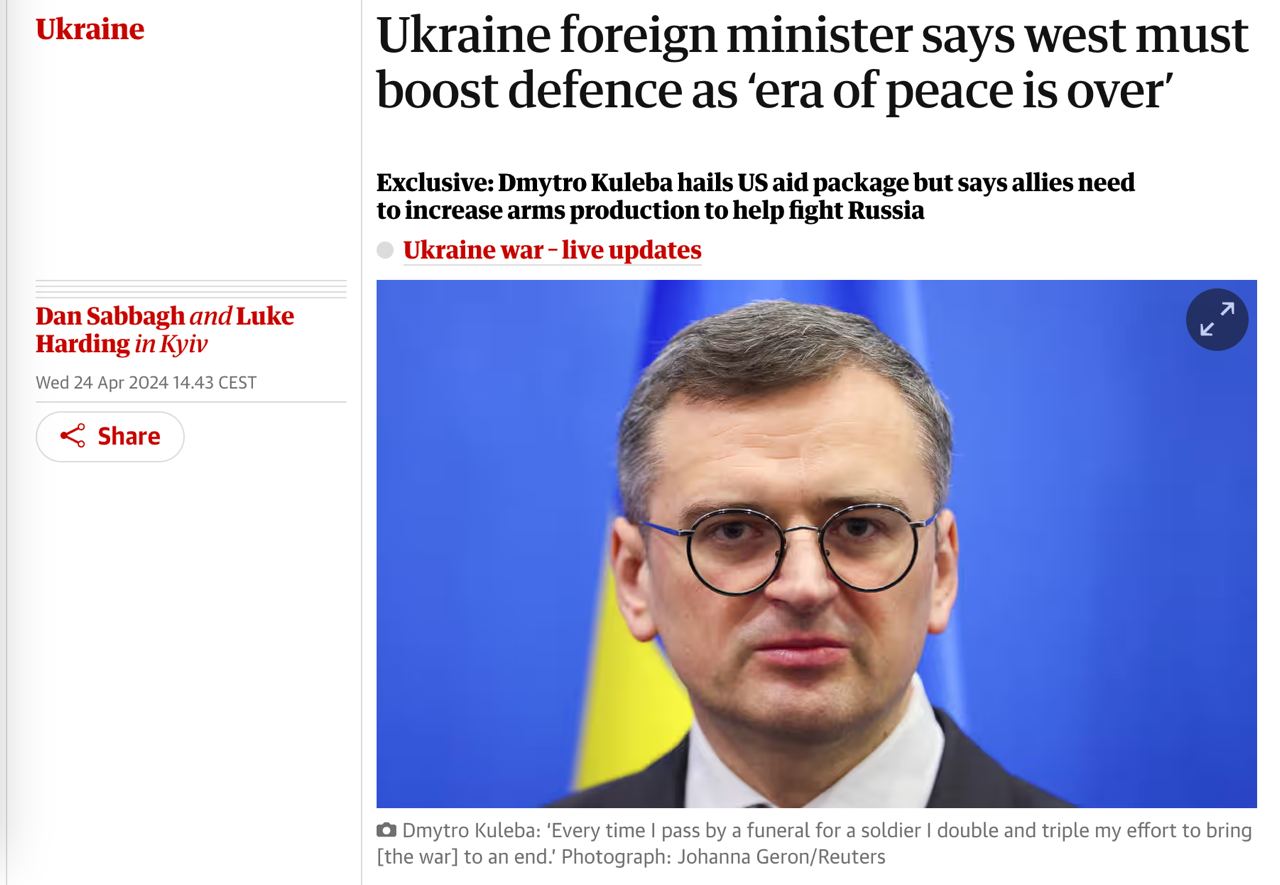 "Когда я вижу, чего добилась Россия в создании оборонно-промышленной базы за два года войны и чего добился Запад, я думаю, что со стороны Запада что-то не так. Запад должен осознать, что эра мира в Европе закончилась", - сказал Кулеба.