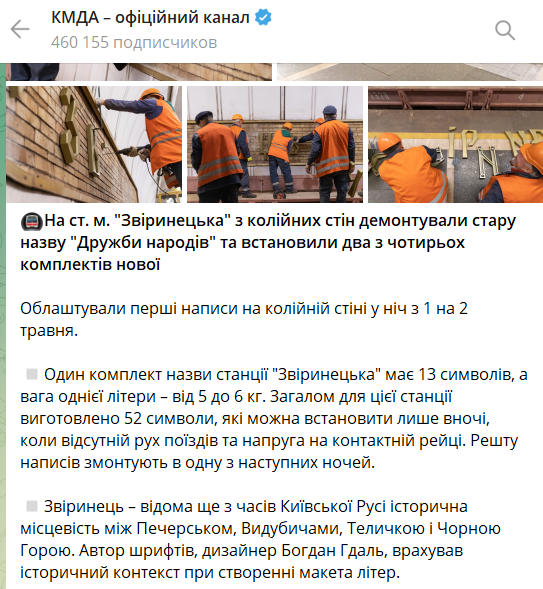 В КГГА рассказали, что один комплект названия станции "Зверинецкая" имеет 13 символов, а вес одной буквы – от 5 до 6 кг. В общей сложности для этой станции изготовлено 52 символа, которые можно установить только ночью, когда отсутствует движение поездов и напряжение на контактном рельсе. Остальные надписи смонтируют в одну из следующих ночей.