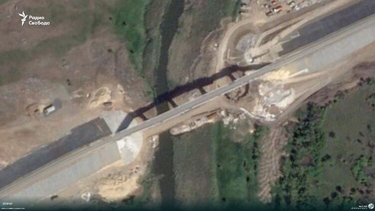 Спутниковые снимки, изученные Радио Свобода, также показывают, что уже завершено сооружение самого большого моста на новом участке - в районе села Гранитное.