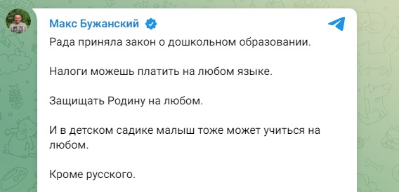 Документ разрешает обучение в детсадах на языке коренных народов или национальных меньшинств. Однако Бужанский заявил, что обучение на русском языке проектом не разрешается.