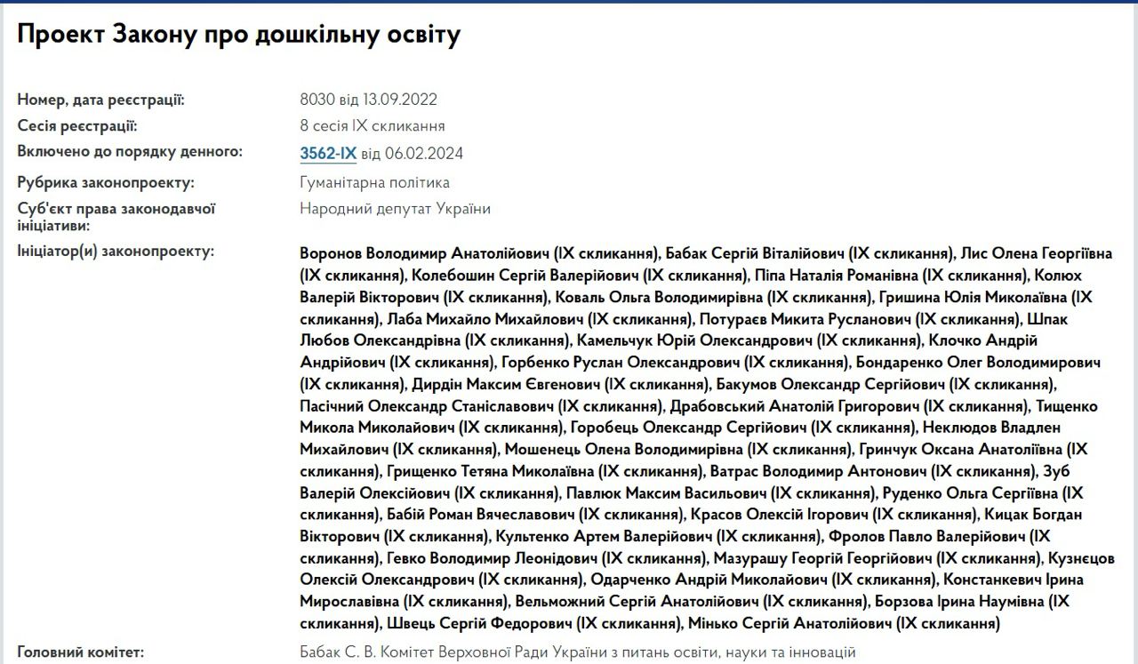 Один из инициаторов проекта, председатель подкомитета по вопросам раннего развития и дошкольного образования комитета Рады по вопросам образования, науки и инноваций Владимир Воронов заверял, что при подготовке документа "учли самый лучший отечественный и мировой опыт, а также евроинтеграционные процессы".
