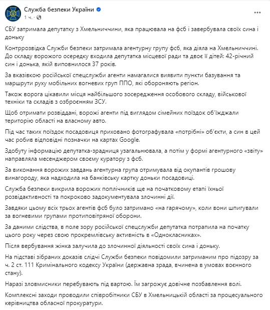 "Контрразведка Службы безопасности задержала действующую в Хмельницкой области агентурную группу ФСБ. В состав вражеской ячейки входила депутат местного совета и двое его детей: 42-летний сын и дочь, которой исполнилось 37 лет", - говорится в сообщении.