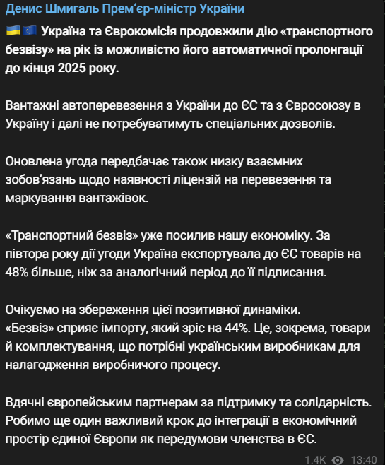 Украина и Еврокомиссия продлили действие "транспортного безвиза" еще на год - Шмыгаль