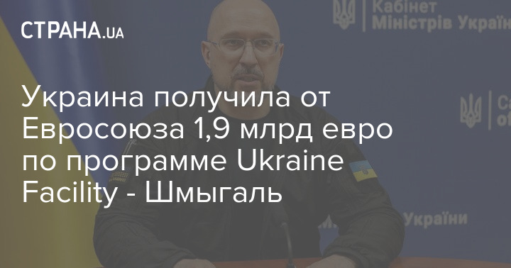 Украина получила от Европейского союза 1,9 млрд евро по программе Ukraine Facility. Об этом сообщает премьер Украины Денис Шмыгаль.