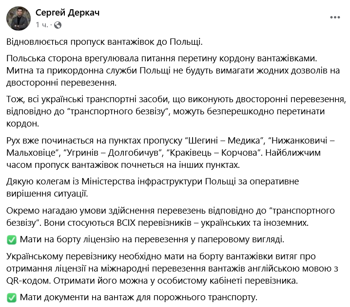 Позже Деркач опубликовал в Фейсбуке новое сообщение и заявил, что Польша уже разблокировала границу для украинских грузовиков.