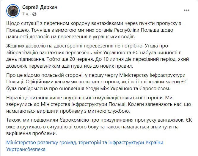 По словам замминистра Сергея Деркача, для пересечения границы с Польшей перевозчикам не требуется никаких разрешений. Украина обратилась в Министерство инфраструктуры Польши и Еврокомиссию.
