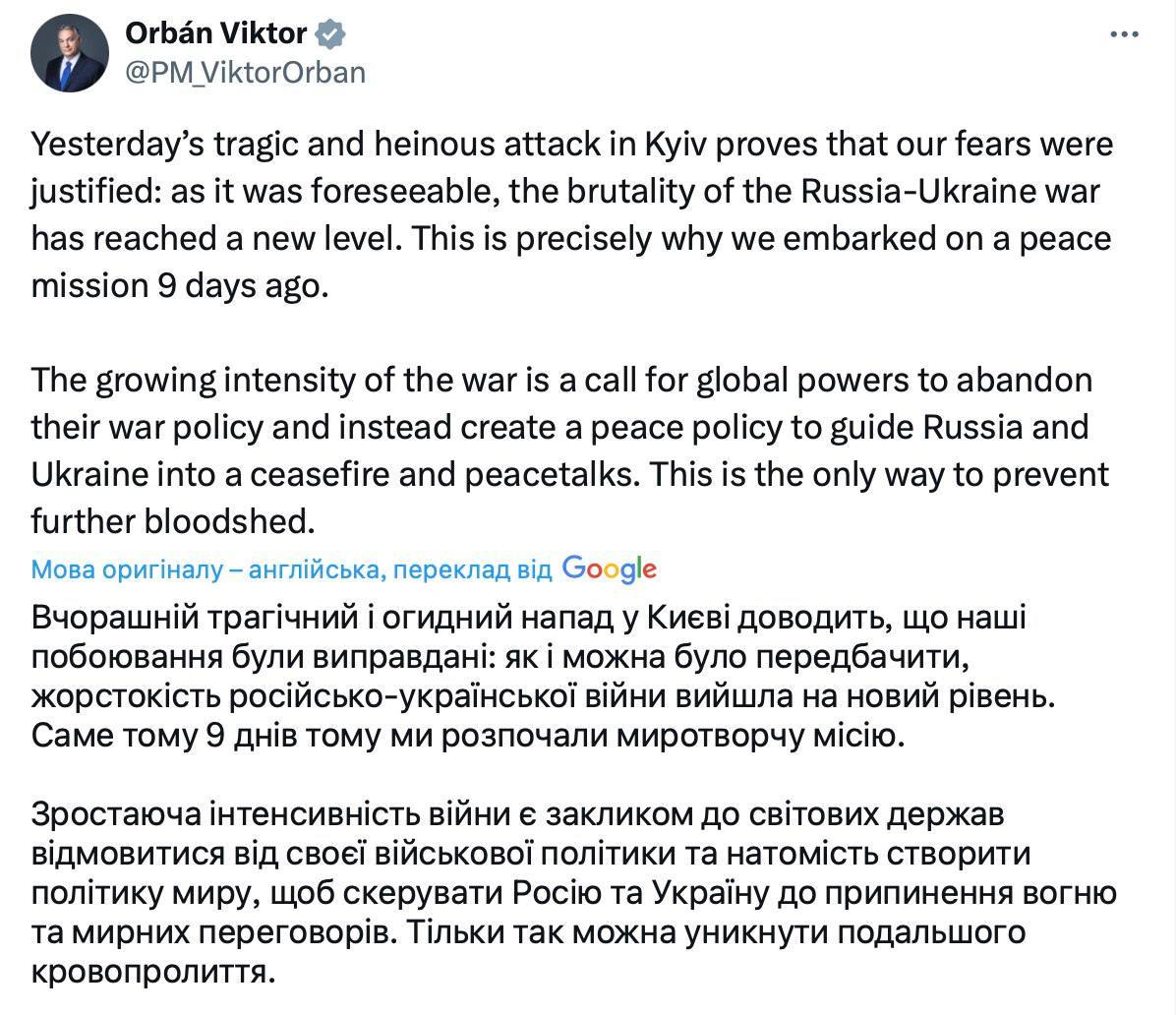 "Жестокость российско-украинской войны вышла на новый уровень", - написал в соцсети Х венгерский премьер.