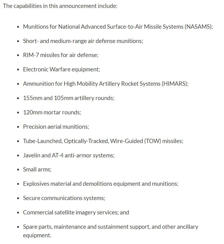 Между тем Пентагон опубликовал полный список того, что вошло в новый пакет военной помощи Украине от США: