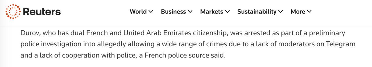 А вот агентство Reuters со ссылкой на источник в местной полиции пишет, что Дурова задержали из-за отказа Телеграма сотрудничать по вопросам финансовых и киберпреступлений.