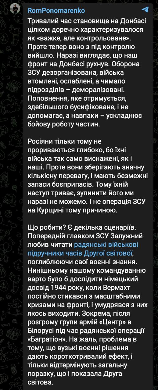 "Долгое время положение на Донбассе вполне уместно характеризовалось как тяжелое, но контролируемое. Однако теперь оно из-под контроля вышло. Пока выглядит, что наш фронт на Донбассе рухнул. Оборона ВСУ дезорганизована, войска устали, ослаблены, а многие подразделения деморализованы. Получаемое пополнение в основном бусифицировано, и не помогает, а, наоборот, усложняет боевую работу частей. Россияне только потому не прорываются глубоко, что их войска так же истощены, как и наши. Однако они сохраняют значительное количественное преимущество и имеют безграничные запасы боеприпасов. Поэтому их наступление продолжается, остановить его мы пока не можем", - написал военный.