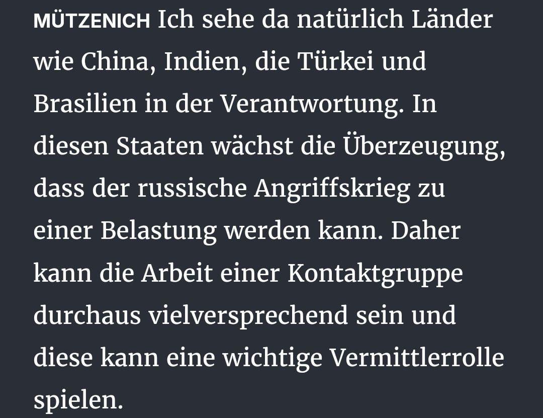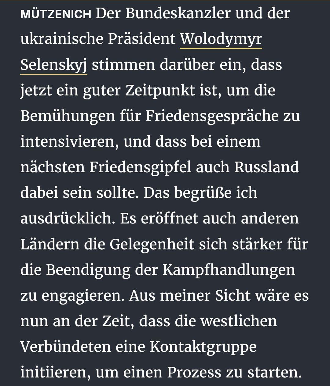 "Федеральный канцлер и президент Украины Владимир Зеленский согласны с тем, что сейчас подходящий момент для активизации усилий по проведению мирных переговоров, и что на следующем мирном саммите Россия также должна присутствовать. Я это однозначно приветствую. Это также даёт другим странам возможность активнее участвовать в прекращении боевых действий. На мой взгляд, пришло время для западных союзников инициировать контактную группу, чтобы запустить этот процесс", - сказал Мютцених.