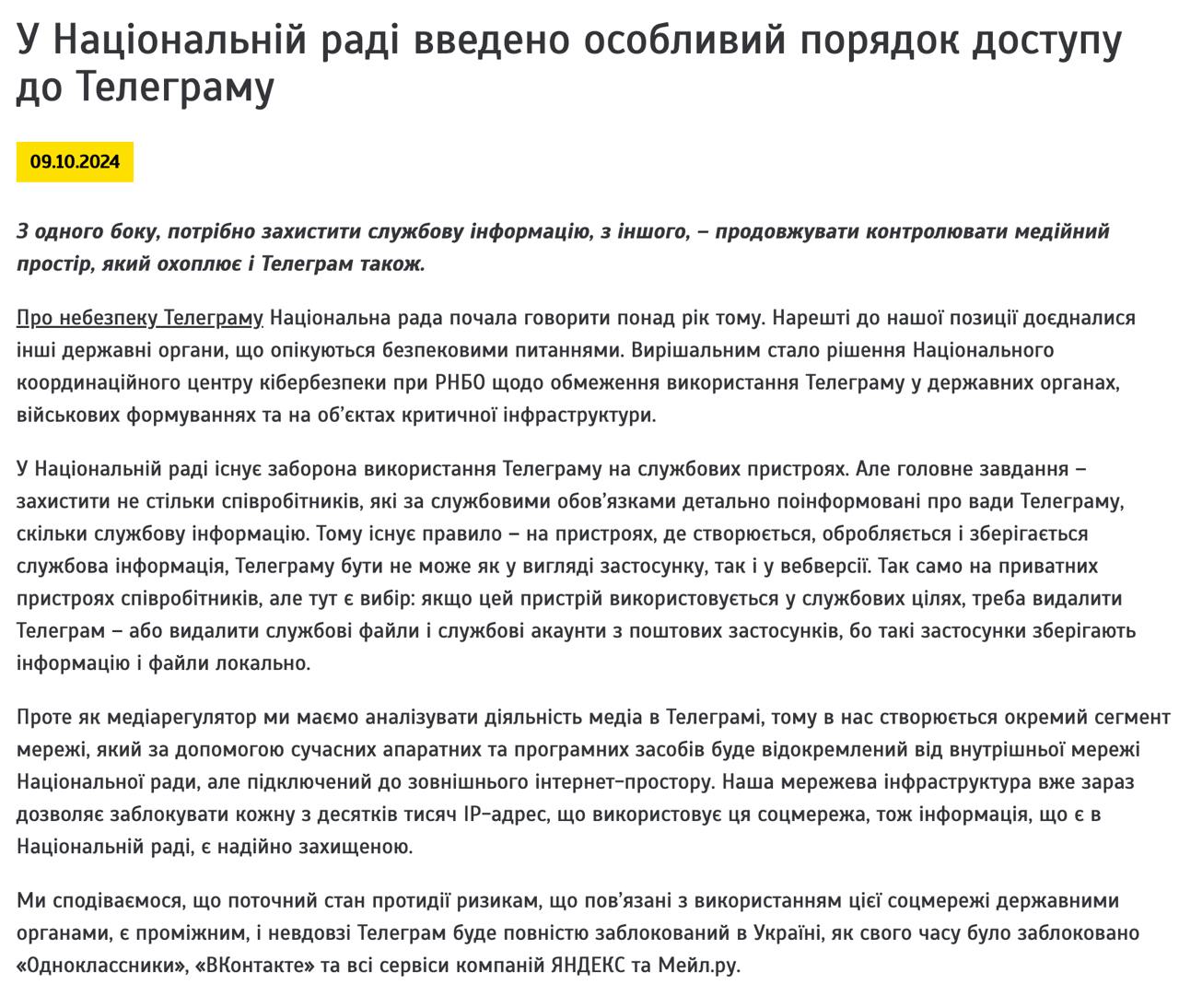 Нацсовет информирует, что он также запретил своим сотрудникам использовать Телеграм на служебных компьютерах.