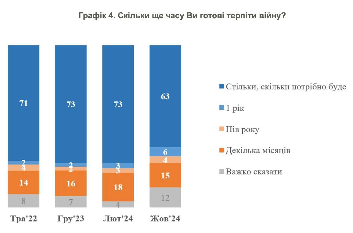 Между февралем и октябрем 2023 года с 22 до 49% стало больше тех, кто верит, что Россия все равно сохраняет значительный запас ресурсов и может еще много лет вести войну против Украины. С 67% до 43% уменьшилась доля тех, кто, наоборот, считает, что Россия исчерпывает свои ресурсы и в обозримом будущем война может завершиться на приемлемых для Украины условиях. Между октябрем 2023 года и октябрем 2024 года ситуация почти не изменилась, хотя сейчас практически установилась паритетность мнений: 47% украинцев считают, что у России достаточно ресурсов для длительной войны против Украины, а 46%, наоборот, считают, что Россия исчерпывает запасы своих ресурсов.