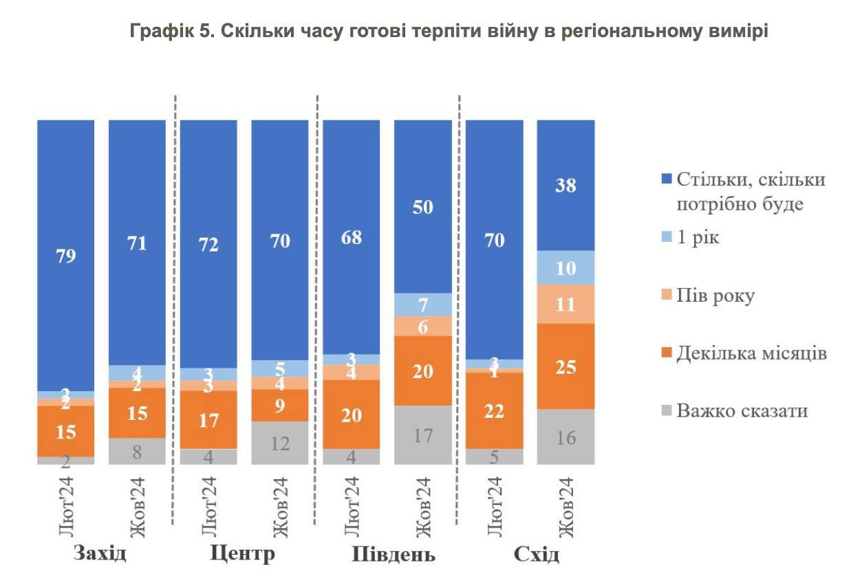 За эти полгода резко выросло количество тех, кто затруднился ответить на вопрос о том, сколько они готовы терпеть войну (12% против 4%). На 4% больше людей сказали, что готовы потерпеть еще полгода-год.