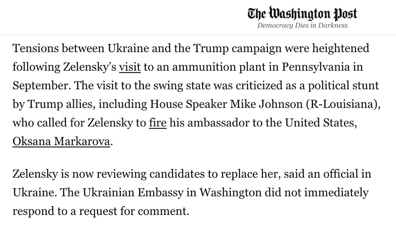 "Напряженность между Украиной и командой Трампа усилилась после визита Зеленского на завод по производству боеприпасов в Пенсильвании в сентябре. Сторонники Трампа, включая спикера Палаты представителей Майка Джонсона, который призвал Зеленского уволить посла в США Оксану Маркарову, раскритиковали визит в колеблющийся штат как политический трюк. Зеленский сейчас пересматривает кандидатов на ее замену, сказал чиновник в Украине", – говорится в статье.