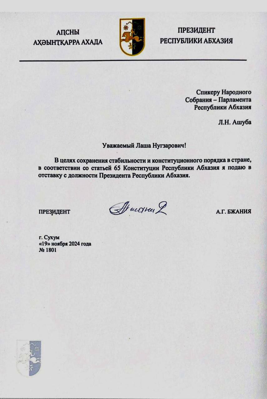 Сообщается, что Аслан Бжания подаёт в отставку, а протестующие 19 ноября должны покинуть все правительственные здания и разойтись.