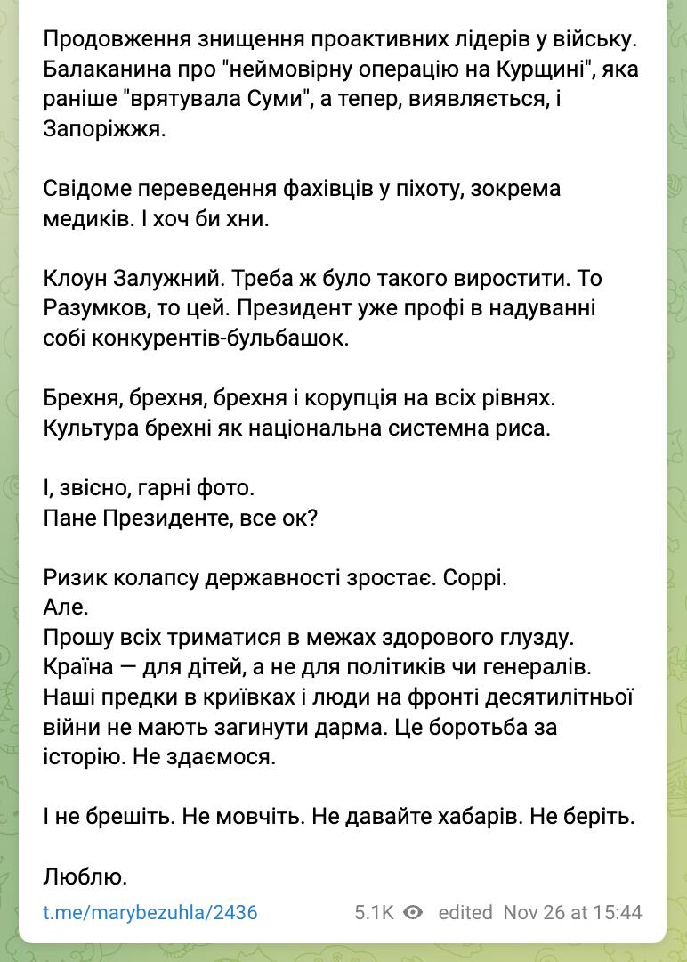 - "Продолжение уничтожения проактивных лидеров в армии. Болтовня о "невероятной операции на Курщине", которая раньше "спасла Сумы", а теперь, оказывается, и Запорожье".