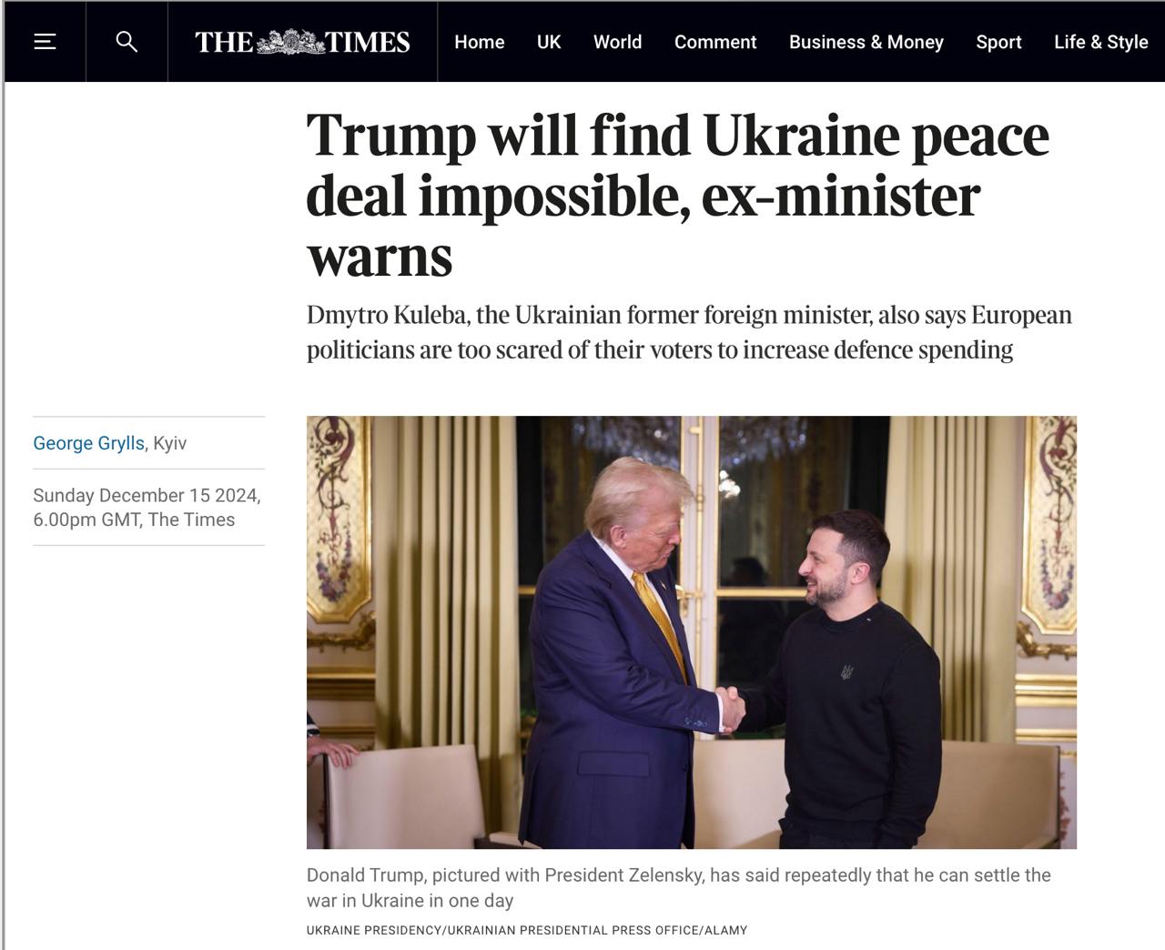 В свою очередь бывший министр иностранных дел Украины Дмитрий Кулеба считает, что новоизбранному президенту США Дональду Трампу не удастся достичь быстрого завершения боевых действий в Украине, пишет газета The Times.