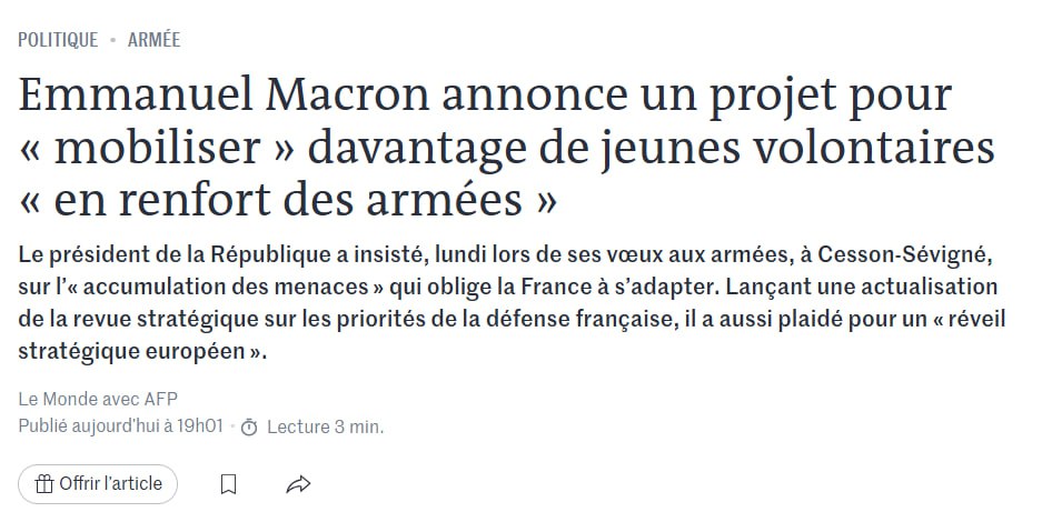 Макрон также призвал свое правительство облегчить набор добровольцев во французскую армию, чтобы «когда придет время, усилить армию на материковой Франции или в других местах».