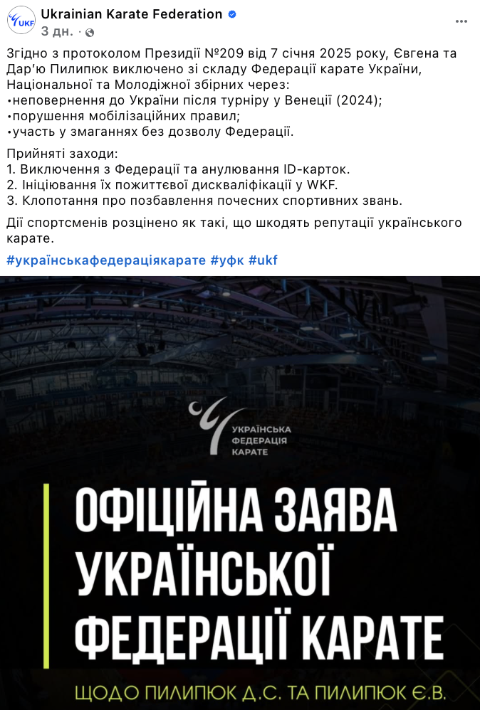 Украинская федерация карате лишила их членства в организации за "невозвращение в Украину и нарушение правил мобилизации". Также в УФК заверили, что будут добиваться от Всемирной федерации карате пожизненной дисквалификации спортсменов и лишения спортивных наград.