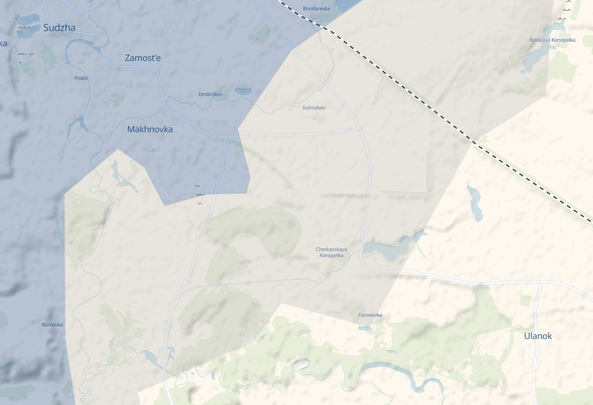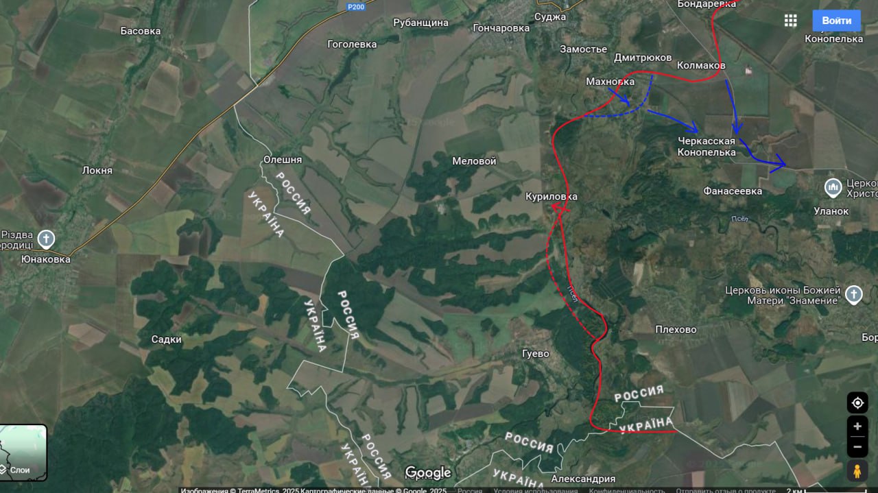 Российские военные телеграм-каналы сообщают об атаке ВСУ в направлении сел Черкасская Конопелька (некоторые российские паблики говорят о занятии подразделениями ВСУ части этой деревни, другие пишут, что украинские силы высадили десант вблизи его и там сейчас идут бои, а в самом селе их нет) и Уланок.