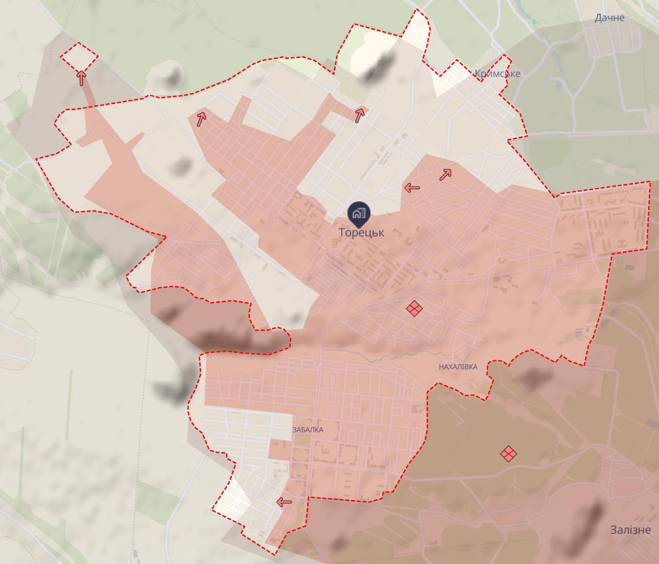На карте Deep State большая часть Торецка указана под контролем РФ или в серой зоне. Но указано и несколько небольших участков на окраинах под контролем ВСУ.